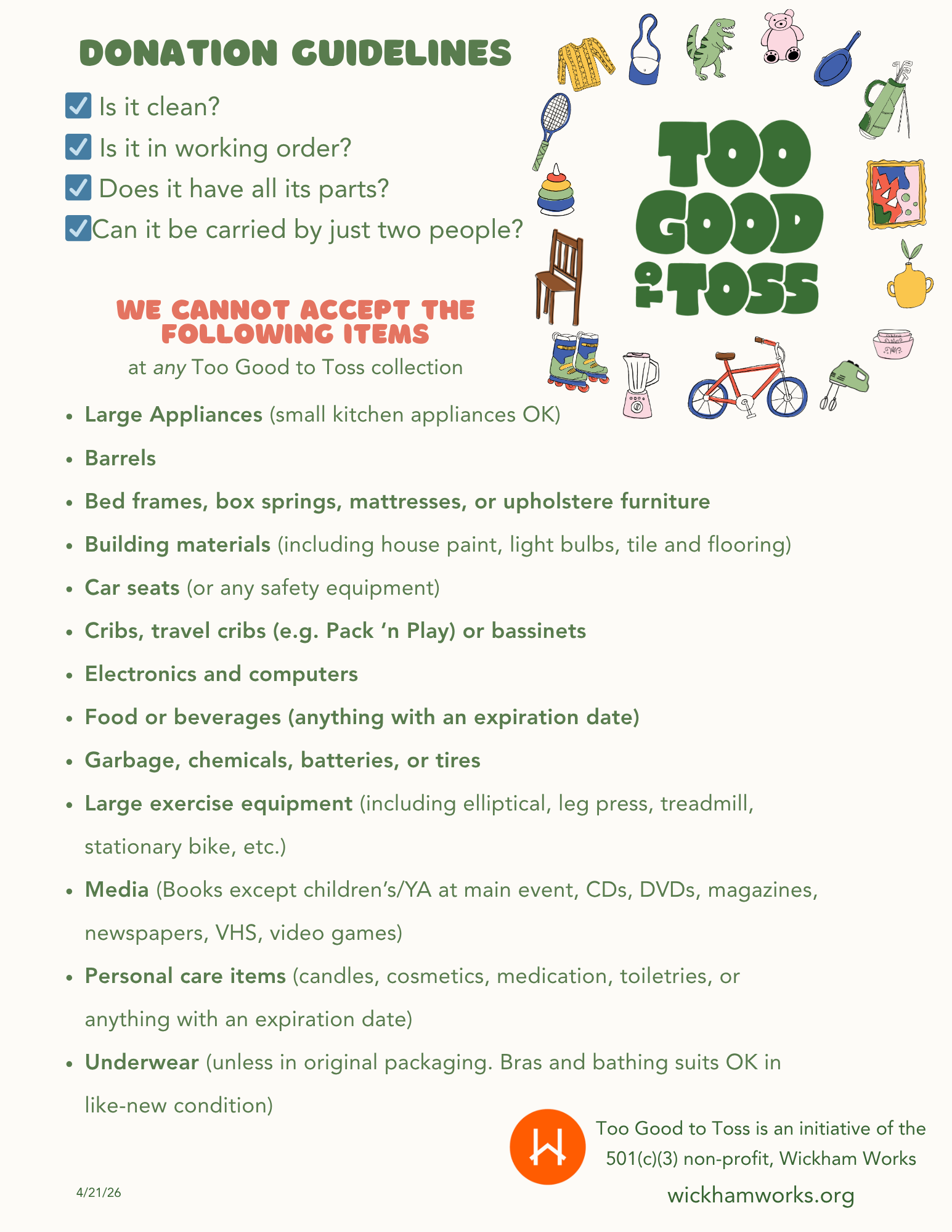 For the Too Good To Toss Main Event, we accept donations on Saturday only from 10am-4pm. Bring your items to the donation station, you will be asked to immediately remove anything we cannot accept. Please review this page for a list of items we cannot accept at this event.